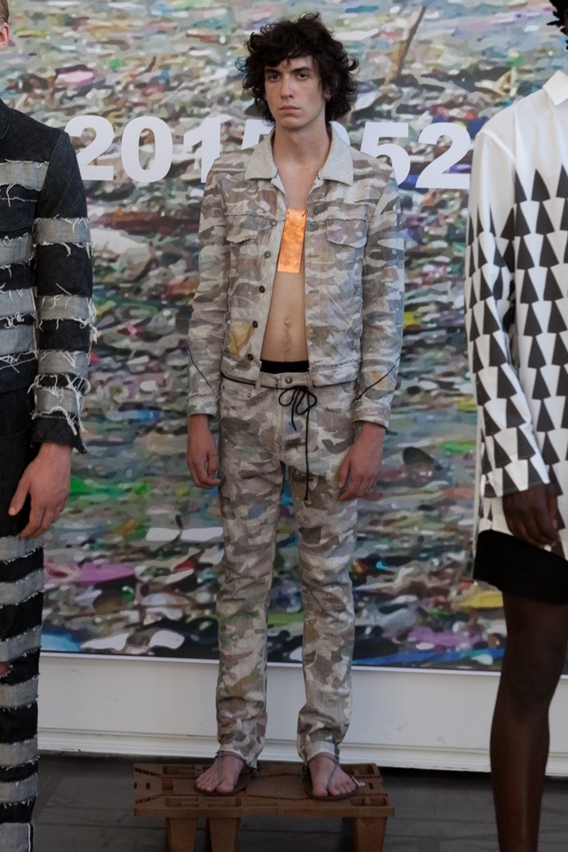 For one No Editions is a brand that is used to its ‘logo and word (name) to express negation, dissent, denial, or refusal’ as our press paper reads, and key topics in the SS16 collection are the global pollution of oceans as well as global data retention. Designer activism if you will. We noticed a similar social activist topic earlier in the week with Walter van Beirendonck who named his show Electric Eye, and in London with Vivienne Westwood, but here at No Editions the devil is in the detail. We’ll explain it.