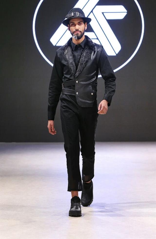LAT has done a incredible job honoring his Latin American heritage and depicting what a modern day gentleman, brave enough to break social and cultural norms should wear. The collection is basic in color and structural in design. Lautaro has created monochromatic outfits in black, white, grey and navy blue, using noble materials like leather, wool and fur.