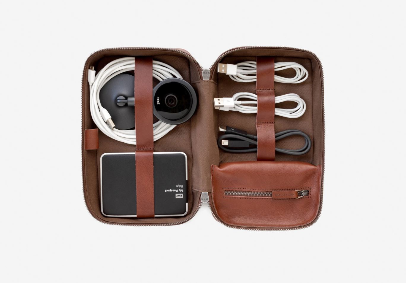 It’s not uncommon for the traveling man to have a million devices: phone, camera, laptop, tablet, e-reader, headphones, adapters and of course — chargers for all of these items and more. This leather zip-up organizer, the Tech Dopp Kit 2 from This is Ground is a travel ‘bag’ designed with compartments to fit all the electronic accessories and strap down the cords and chargers too. ($229)