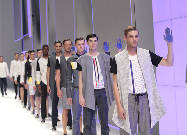 Suay took his inspiration for this collection called Lapislazuli (Ultramarine, in English) the Mediterrean sea and we can feel the pops of blue coming out in the clothes, not to mention the subtle streak of blue in the each of the model’s hair and blue paint on the inside of their hands.