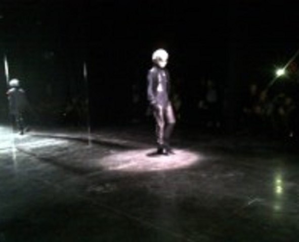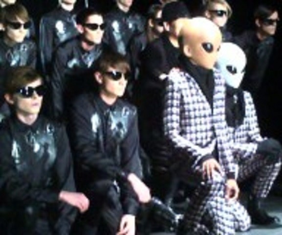 One of the great things when talking about Roswell Aliens (the theme for this RYNSHU show) is that whenever you see a photograph of one it is never really clear so as to defy disbelief or truth or proof of any identity; and so it was a lucky strike of fate when the BDMOTP photographer couldn’t make it to the RYNSHU show on the last day of Paris men’s fashion week, a Sunday, when we had to struggle to make pictures with an obscure and old handheld mobile camera, an old Blackberry Curve, which means that what you see here judging from the grainy picture above MAY actually or MAY NOT have been what really appeared on the runway – you will just have to take our word for it –, whereas according to the press release the image was supposed to be a ‘Little Grey’ alien.