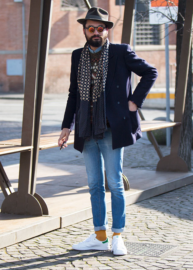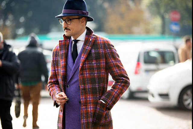 Loving these layers spotted in Milan, not to mention the copper jacket! Photo courtesy of Darrel Hunter.